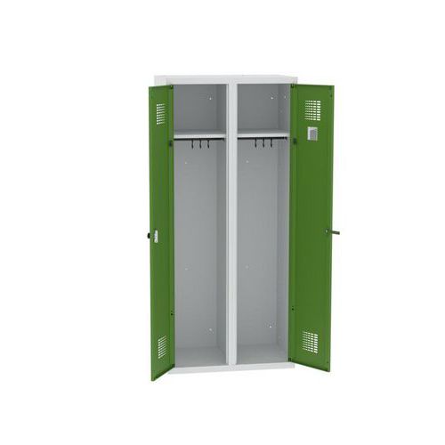 Svařované šatní skříně se skládají ze dvou oddílů s jedním společným zámkem. Levé a pravé otevírání dveří umožňuje rychlý přístup do celé skříňky. Vyrobené z ocelového plechu tl. 0,5 mm s vyztuženými svary. Účinné odvádění vlhkosti z oděvů ventilačními otvory na dveřích skříně. Uzamykání na pravém křídle jednobodovým cylindrickým zámkem, levé křídlo má otevírání hliníkovým knoflíkem. Možnost umístění štítku se jménem v horní části dveří. Povrchová úprava práškovou barvou.