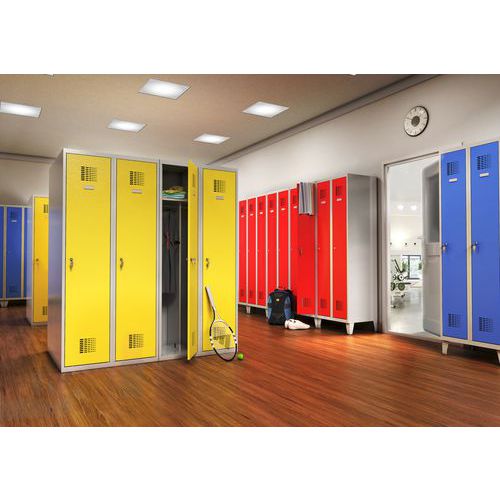 Svařované šatní skříně mají odlehčenou konstrukci a jsou vybaveny výztuhami zajišťujícími dobrou stabilitu. Skříně se skládají ze dvou samostatně uzamykatelných oddílů. Dveře jsou perforované pro optimální ventilaci a jsou umístěné na vnitřních pantech. Uzamykání cylindrickým zámkem s možností výměny za otočný uzávěr (nutné dokoupit zvlášť). Možnost umístění štítku se jménem v horní části dveří. Bezpečnostní pokyny: Nábytek postavte na rovný a plochý povrch. Připevněte jej ke zdi nebo k příčce pomocí vhodného upevnění. Dbejte na správné rozmístění zátěže a nepřekračujte maximální povolené zatížení.