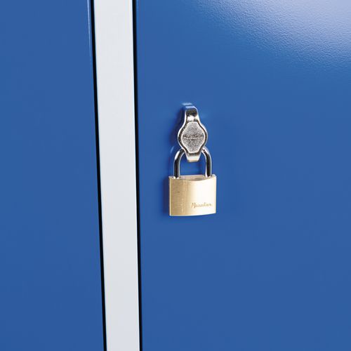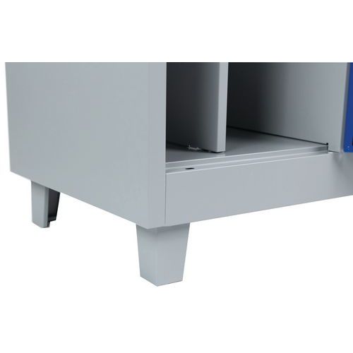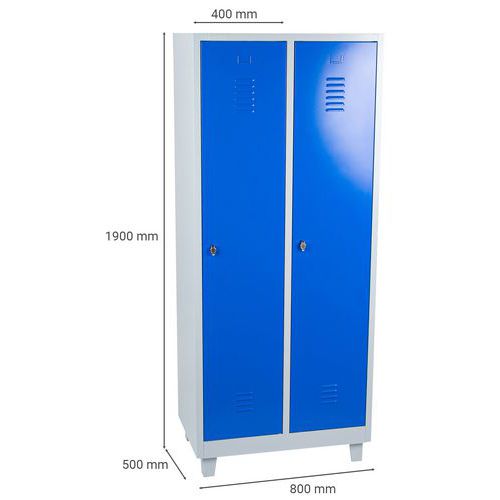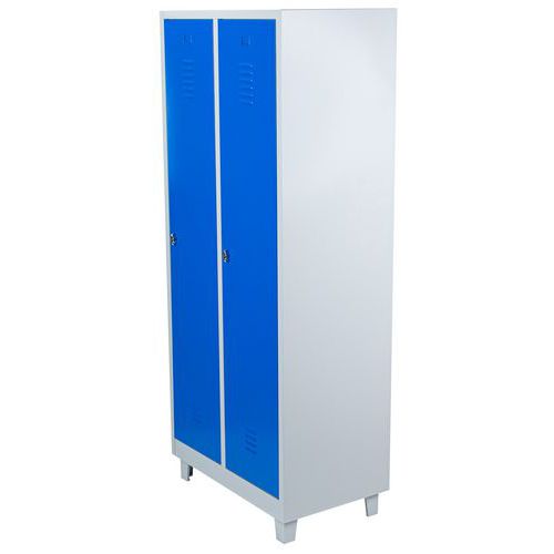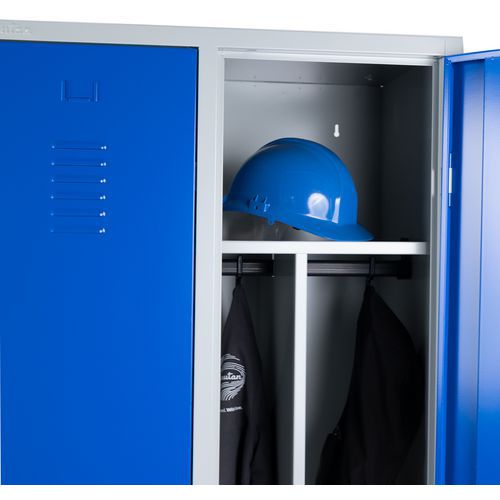 Svařovaná šatní skříň s mezistěnou Manutan Expert DURO PROFI na nohách, 2 oddíly, šedá/modrá, otočný uzávěr