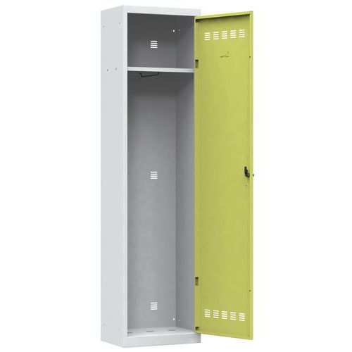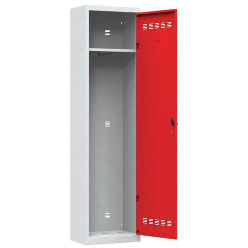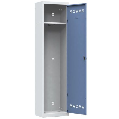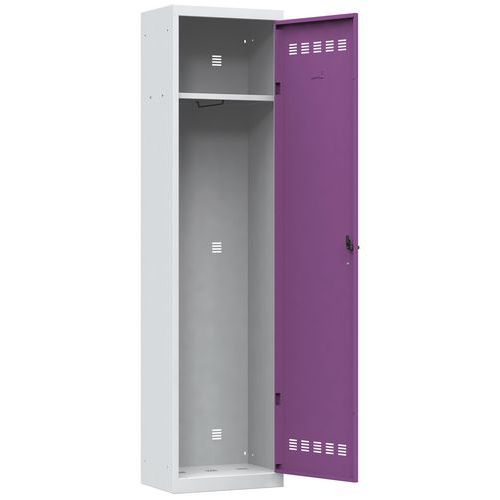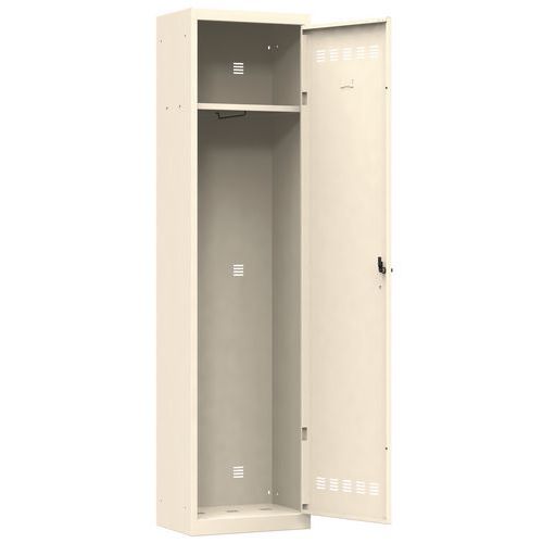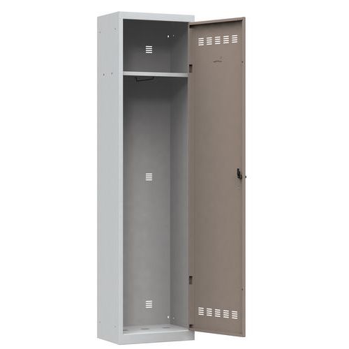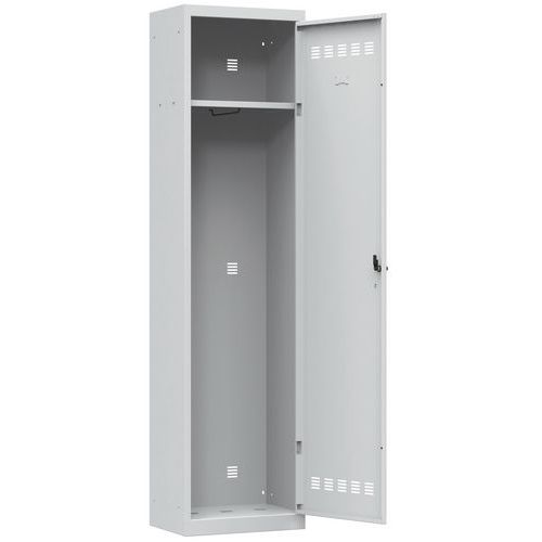 Šatní skříň svařovaná z ocelového plechu tloušťky 0,7 mm. Vybavena tyčí na ramínka. Uzamykání otočným uzávěrem na visací zámek (není součástí dodávky). Perforovaná dvířka zajišťují účinné odvětrávání vnitřního prostoru. Možnost umístění štítku se jménem.