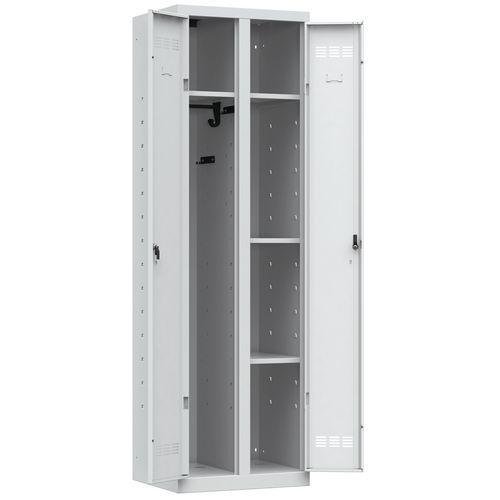 Svařovaná víceúčelová skříň svařovaná z ocelového plechu tloušťky 0,7 mm. Vnitřní prostor obsahuje oddíl pro odložení oblečení (včetně tyče na ramínka s háčky) a oddíl rozdělený do sekcí pro uložení pomůcek, materiálu apod. Uzamykání cylindrickým zámkem se dvěma klíči. Ventilace ve dveřích, možnost umístění štítku se jménem.