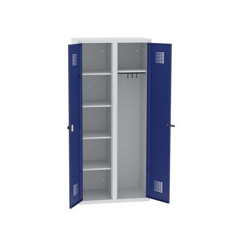 Svařované skříňky vhodné pro uložení úklidových pomůcek. Levé a pravé otevírání dveří umožňuje rychlý přístup do celé skříňky. Skříň je rozdělená na dva oddíly, z nichž jeden je vybaven čtyřmi policemi a druhý oddíl má jednu polici v horní části skříně. Vyrobené z ocelového plechu tl. 0,5 mm s vyztuženými svary. Účinné odvádění vlhkosti ventilačními otvory na dveřích skříně. Uzamykání na pravém křídle jednobodovým cylindrickým zámkem, levé křídlo má otevírání hliníkovým knoflíkem. Možnost umístění štítku se jménem v horní části dveří. Povrchová úprava práškovou barvou.