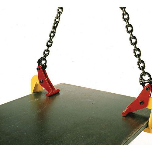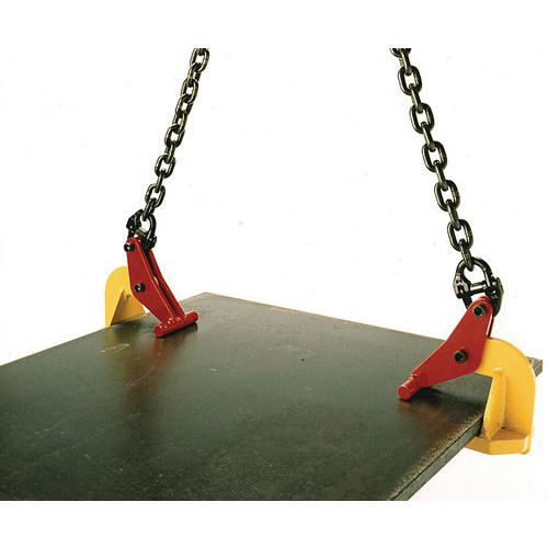 Kovové svěrky pro horizontální zvedání desek a plechů. Opatřené pákou, která zajišťuje upnutí břemena. Nutnost použití v páru. Epoxidová povrchová úprava. Provozní teplota od -20 °C do +100 °C. Splňují normu EN 13155.2003 - bezpečnostní faktor 3.