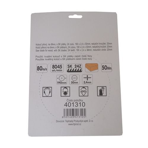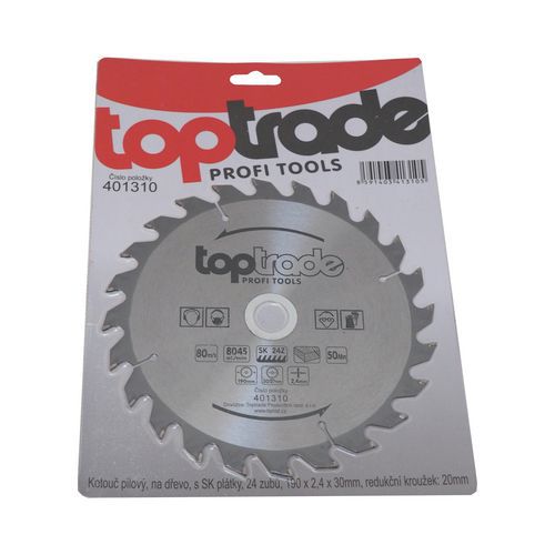| Název produktu | TOPTRADE kotouč pilový, na dřevo, s SK plátky, 24 zubů, 190 x 2,4 x 30/20 mm |