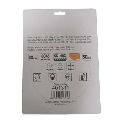 | Název produktu | TOPTRADE kotouč pilový, na dřevo, s SK plátky, 48 zubů, 190 x 2,4 x 30/20 mm |