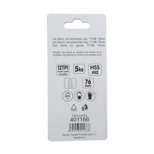 | Název produktu | TOPTRADE list pilový, pro přímočarou pilu, T118B, 76 mm, kov, balení 5 ks |