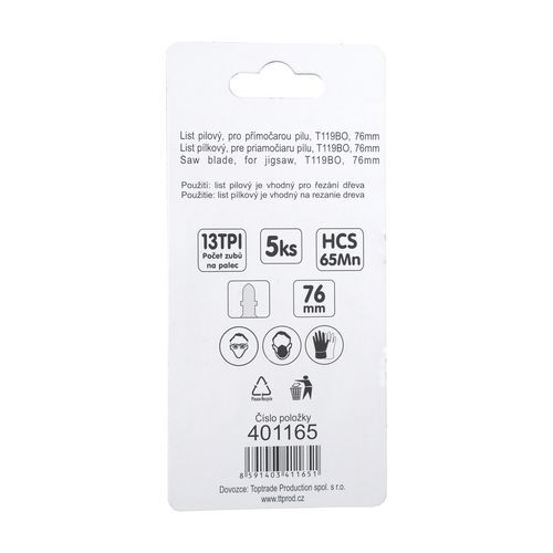 | Název produktu | TOPTRADE list pilový, pro přímočarou pilu, T119BO, 76 mm, dřevo, balení 5 ks |