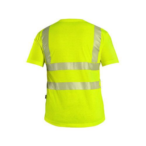 - Pánské výstražné tričko s krátkým rukávem, kulatý průkrčník, zpevňující krční páska, boční švy, síťovina v podpaží, segmentované reflexní pruhy: 2 horizontální, 2 vertikální (šíře 5 cm).
