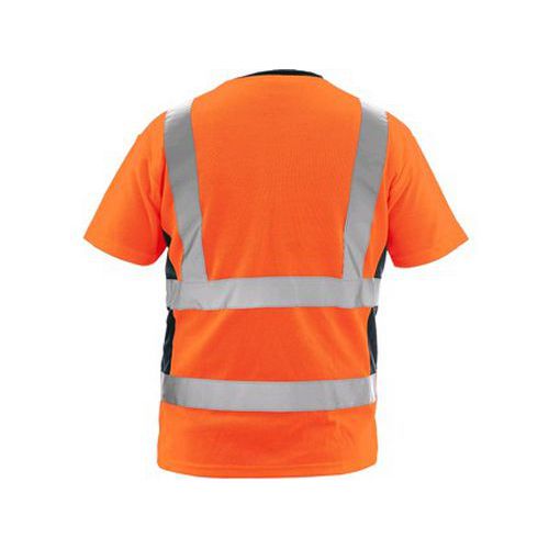 Výstražné tričko s kulatým průkrčníkem v kontrastní modré barvě, krátký rukáv, reflexní pruhy: 2 horizontální, 2 vertikální (šíře 5 cm), po stranách panely ze síťoviny v modré barvě. Doporučené použití: stavebnictví, silničáři, řidiči, logistika, údržba, kolo, motorky, skladování. Velikost: S-XXXL