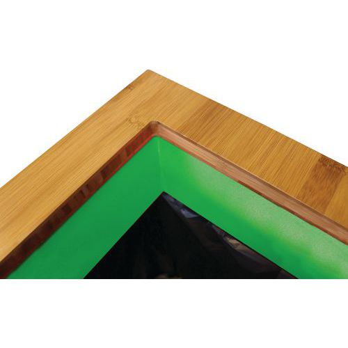 - Stanice na třídění odpadu z pozinkované oceli s elegantním a odolným bambusovým otevíracím víkem, s barevným ukazatelem průtoku a štítkem.