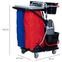 Kompaktní, ale kompletní úklidový vozík s jedním košem a čtyřmi kbelíky.