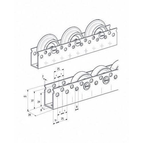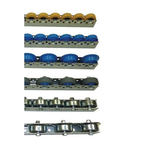 Lišty s jednoduchými kladkami s kluzným ložiskem. Slouží jako univerzální prvky gravitačních dopravníků, montážních linek, spádových regálů a skluzů. U-profil z pozinkovaného plechu. Otvory na spodní straně profilu slouží pro upevnění k podkladu.