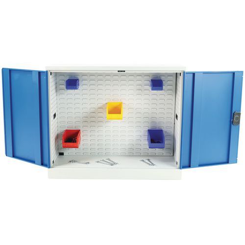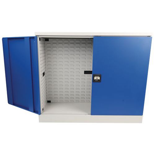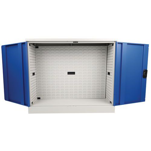 - Dílenská nízká skříňka s perforovanými panely pro uchycení boxů i nářadí na bočních i zadní stěně.