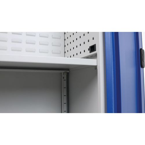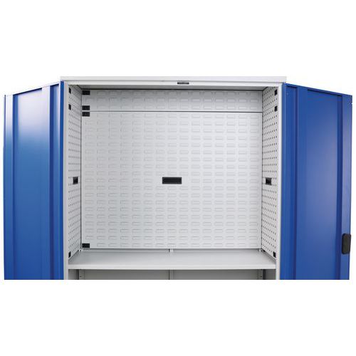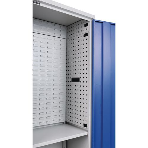 - Dílenská skříň s perforovanými panely pro zavěšení boxů nebo držáků nářadí v horní polovině skříně a 2 policemi.