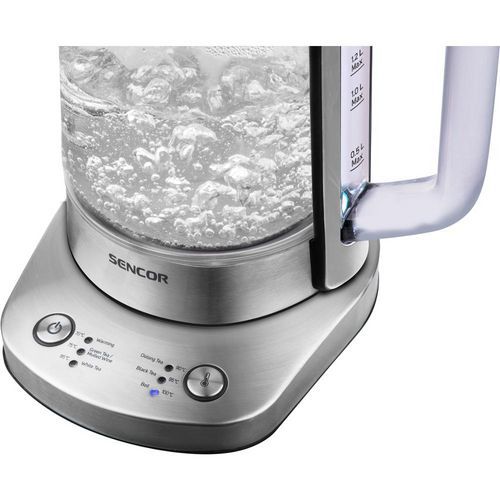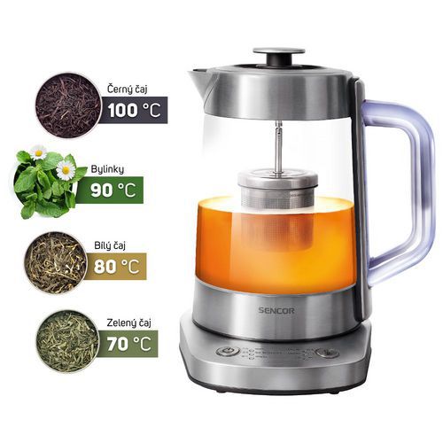 Varná konvice SENCOR s nastavením teploty 70/75/85/90/95/100°C, objemem 1,5 litrů a automatickou funkcí pro udržování teploty nápoje.