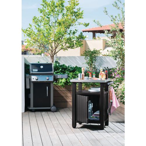 Víceúčelový stůl do venkovní kuchyně s uzavíratelným boxem. Stolek je ideálním pomocníkem při grilování, lze odkládat věci jak na plochu, tak na postranní držáky. Vrchní deska z nerezové oceli. Jednoduché přemístění stolu zajišťují dvě kolečka. Vyrobený z pryskyřic a propylenu, který je odolný vůči povětrnostním vlivům. Maximální nosnost je 50 kg.