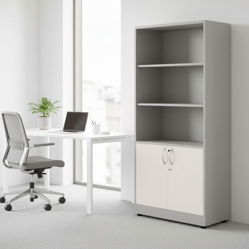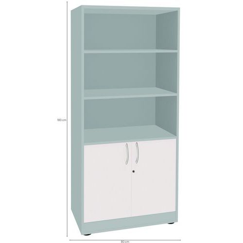 Knihovna se spodní uzamykatelnou skříňkou vhodná do kanceláří. Vyrobená z dřevotřískových desek. Vybavená dvěma pevnými policemi v horní částí a jednou výškově nastavitelnou policí ve spodní skříňce. Kovové úchytky v barvě hliníku. Nastavitelné vyrovnávací nožky.