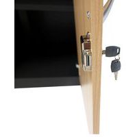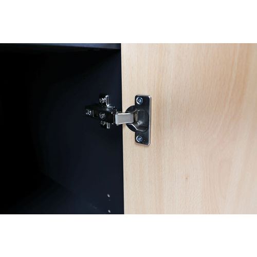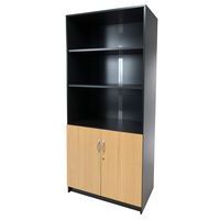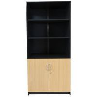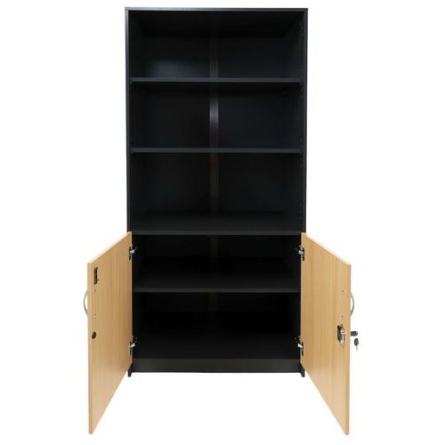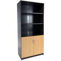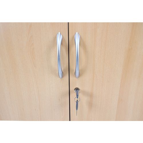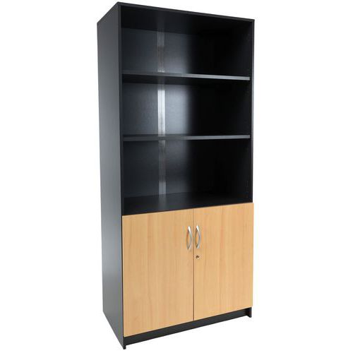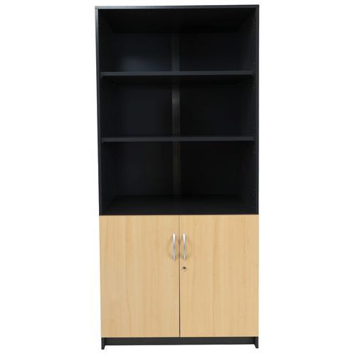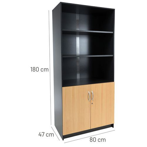 Knihovna se spodní uzamykatelnou skříňkou vhodná do kanceláří. Vyrobená z dřevotřískových desek. Vybavená dvěma pevnými policemi v horní částí a jednou výškově nastavitelnou policí ve spodní skříňce. Kovové úchytky v barvě hliníku. Nastavitelné vyrovnávací nožky.
