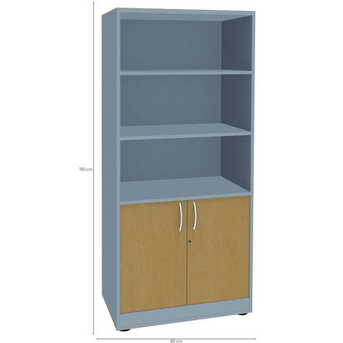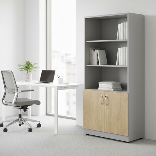 Knihovna se spodní uzamykatelnou skříňkou vhodná do kanceláří. Vyrobená z dřevotřískových desek. Vybavená dvěma pevnými policemi v horní částí a jednou výškově nastavitelnou policí ve spodní skříňce. Kovové úchytky v barvě hliníku. Nastavitelné vyrovnávací nožky.