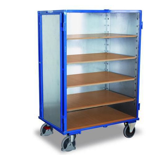 - Vysoké skříňové uzamykatelné vozíky s pěti policemi jsou vhodné pro bezpečnou přepravu a uskladnění zboží.