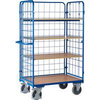 - Vysoký policový vozík se čtyřmi policemi a dvěma mřížovými bočnicemi.