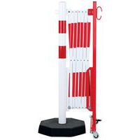 - Skládací ochranná zábrana na kolečkách s brzdami na jedné straně a ochranným sloupkem na druhé straně.