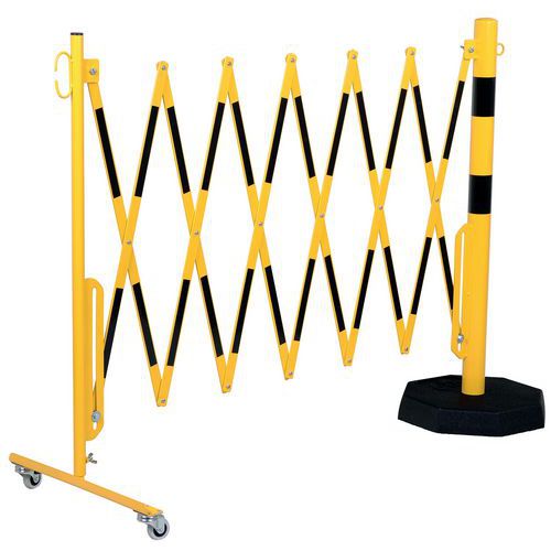- Skládací ochranná zábrana na kolečkách s brzdami na jedné straně a ochranným sloupkem na druhé straně.