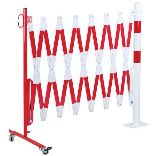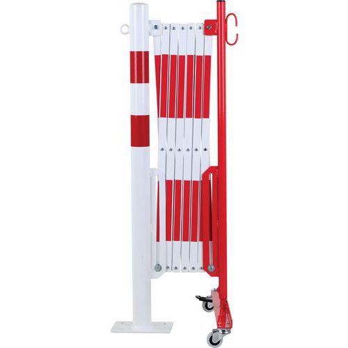 - Výsuvné ocelové zábrany na kolečkách a kulatém sloupku.