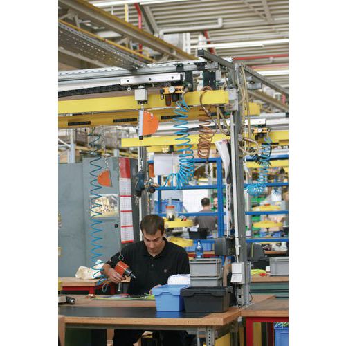 Pružinové navijáky slouží k zavěšení ručního dílenského nářadí a případné fixaci v libovolné výšce. Nářadí tak máte vždy po ruce, bez nároku na odkládací plochu. Lze použít také jako závěsné body při montážních pracích. Zavěšené břemeno se po každém vytažení do libovolné pracovní polohy vrátí zpět do výchozí polohy. Výchozí polohu lze v rámci délky závěsu nastavit předpětím tahu pružiny. Vyvažovač má doplňkové bezpečnostní uchycení a izolované uchycení karabinového háku.