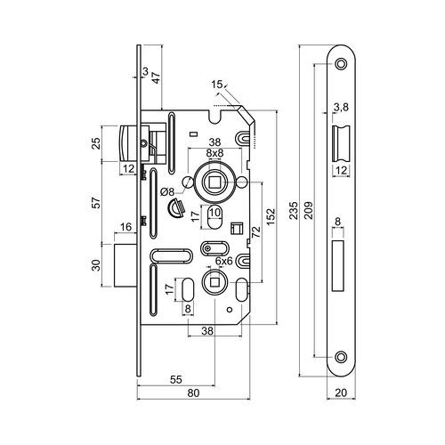 Zadlabací zámky pro WC kličku, 20mm, levý