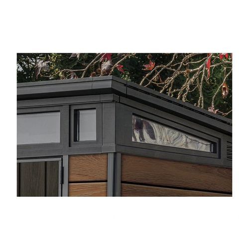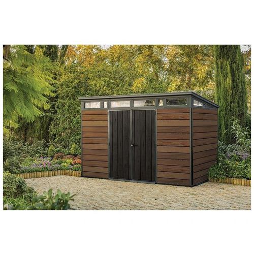 Plastový zahradní domek Horizontal v hnědém provedení je bezúdržbový a je vyroben z jedinečného materiálu Decocoat, který je inspirován moderním vzhledem v imitaci dřeva.