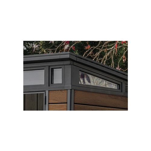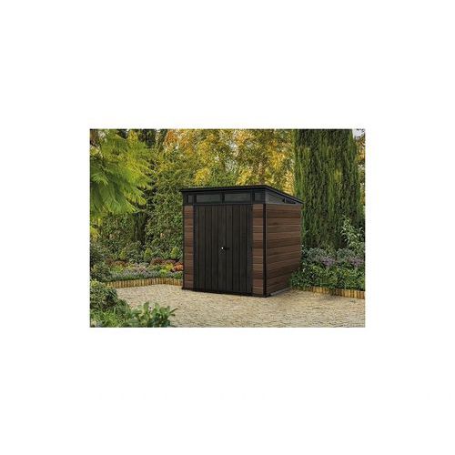 Plastový zahradní domek Horizontal v hnědém provedení je bezúdržbový a je vyroben z jedinečného materiálu Decocoat, který je inspirován moderním vzhledem v imitaci dřeva.