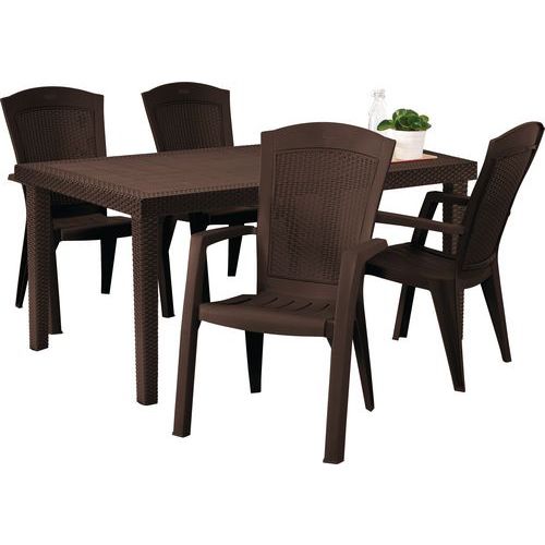 - Vysoký opěrák s imitací ratanu zajišťuje komfortní sezení.