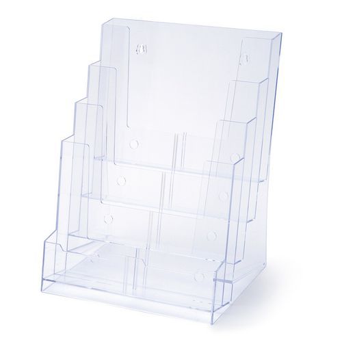 Plastové stojánky na letáky, brožury, propagační materiály apod. Čtyři kapsy ve stupních za sebou orientované na výšku. Možnost upevnění na zeď. Stojánek je standardně dodáván bez potisku.