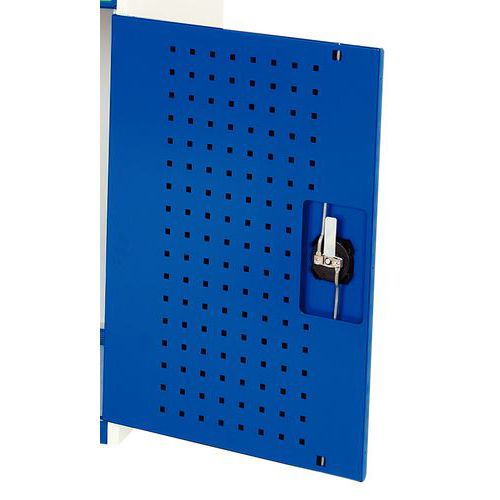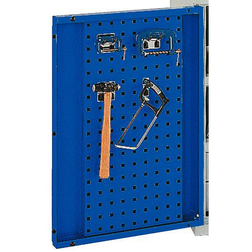 Závěsná kovová skříňka s perforací a sadou držáků na nářadí. Zadní část skřínky a vnitřní část dveří jsou opatřeny perforovanými panely pro uchycení držáků nářadí (typ perfo). Robustní svařovaná ocelová konstrukce s nosností až do 1 tuny, povrchová úprava práškovým lakem. Zamykání cylindrickým zámkem se dvěma klíči. Sada 20 držáků na nářadí obsahuje: 1 x držák imbusových klíčů, 1 x držák šroubováků, 1 x držák vrtáků, 1 x držák klíčů, 1 x držák na pilu, 5 x dvojitý háček Ø6 x 75 mm, 5 x klip na nářadí Ø 13 mm, 5 x jednoduchý háček Ø6 x 25 mm. Sada 40 držáků na nářadí obsahuje: 1 x držák imbusových klíčů, 1 x držák šroubováků, 1 x držák vrtáků, 1 x držák klíčů, 1 x držák na pilu, 5 x dvojitý háček Ø6 x 150 mm, 5 x dvojitý háček Ø6 x 75 mm, 5 x klip na nářadí Ø 13 mm, 5 x klip na nářadí Ø 25 mm, 5 x jednoduchý háček Ø6 x 25 mm, 5 x jednoduchý háček Ø6 x 50 mm, 5 x držák kleští š. 55 mm.