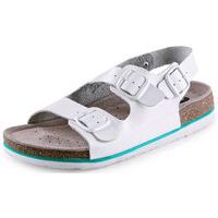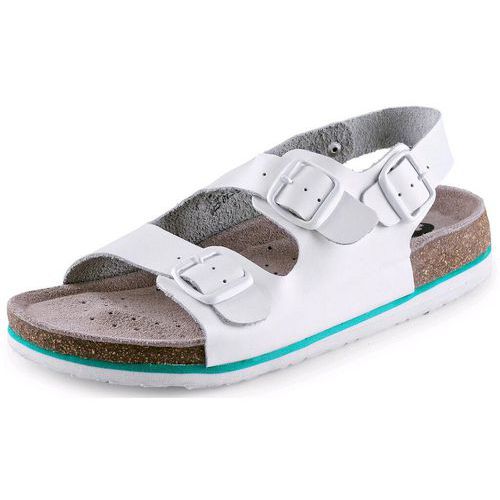 Dámské zdravotní sandály s anatomicky tvarovanou stélkou. Se dvěma nastavitelnými pásky a rovnou podešví. EN ISO 20347: Tato mezinárodní norma stanovuje základní a dodatečné (nepovinné) požadavky na pracovní obuv, která není vystavena mechanickým rizikům (nárazu nebo stlačení).